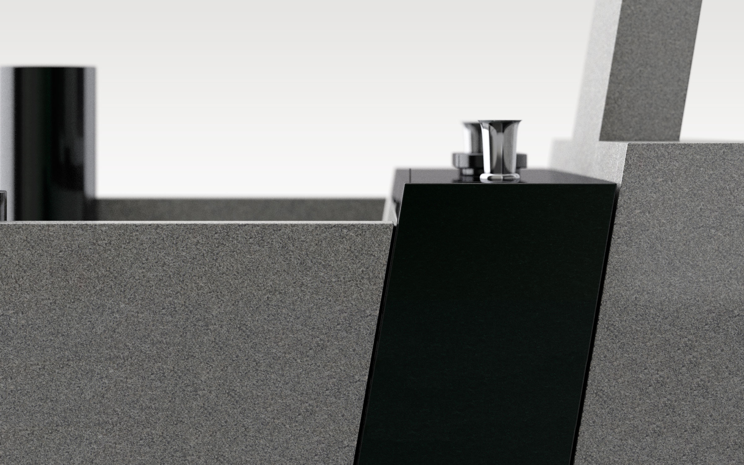 絶妙なバランスで後傾した面を持った石塔が、訪れる人の視線と祈りを静かに受け止めるデザイン。階段状に連なる直線的な構成と、白と黒の明確な対比が、造形の輪郭を美しく際立たせます。