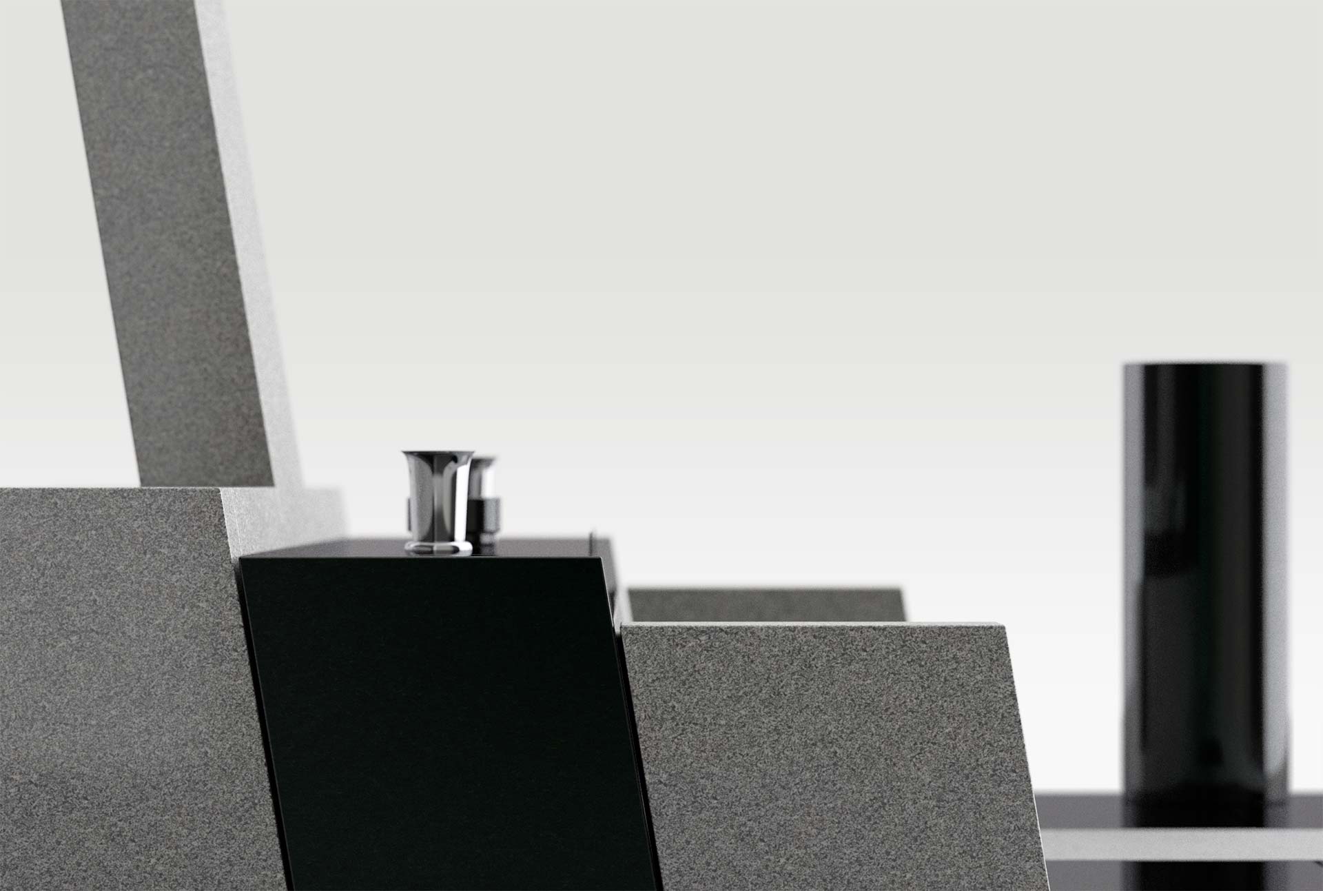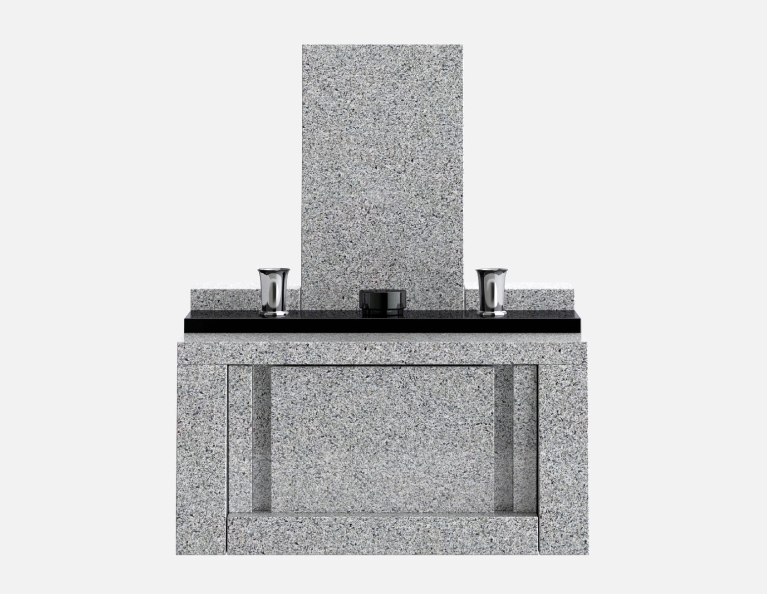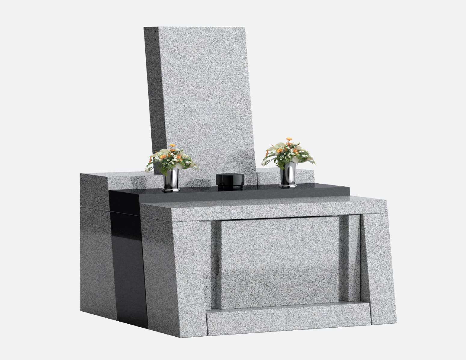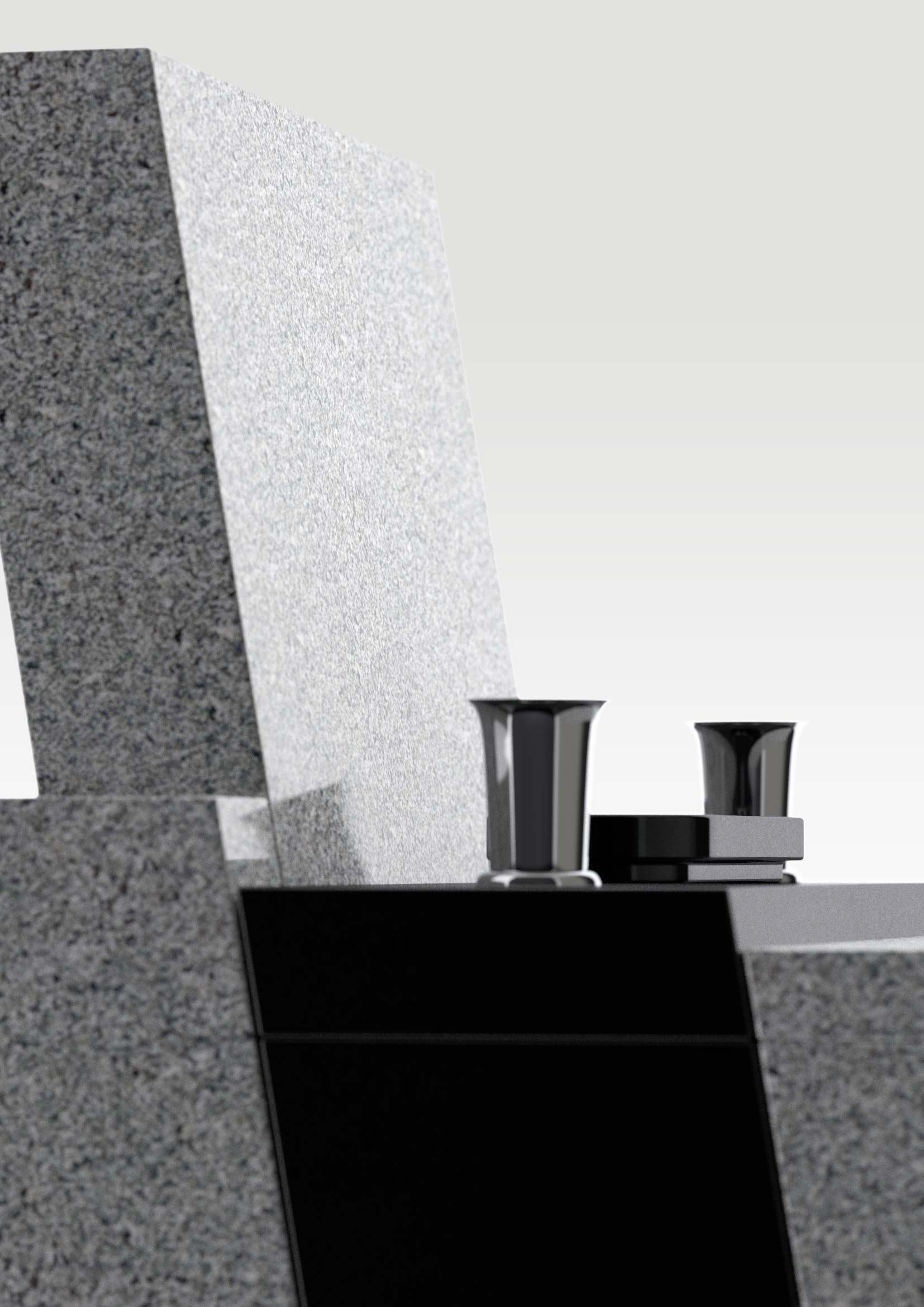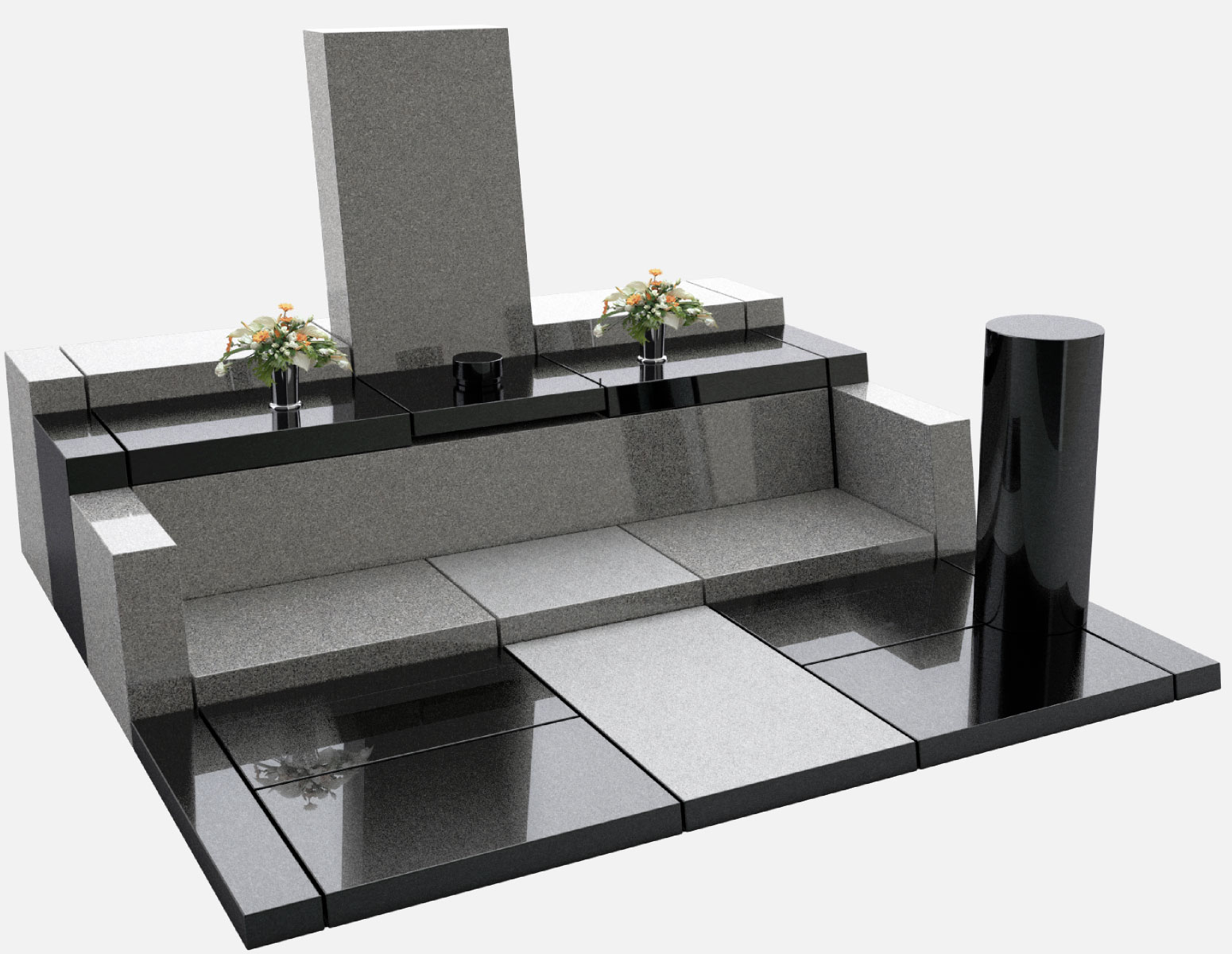 美しい階段状の構成と、全体に後傾した斜めの面が印象的な墓石。